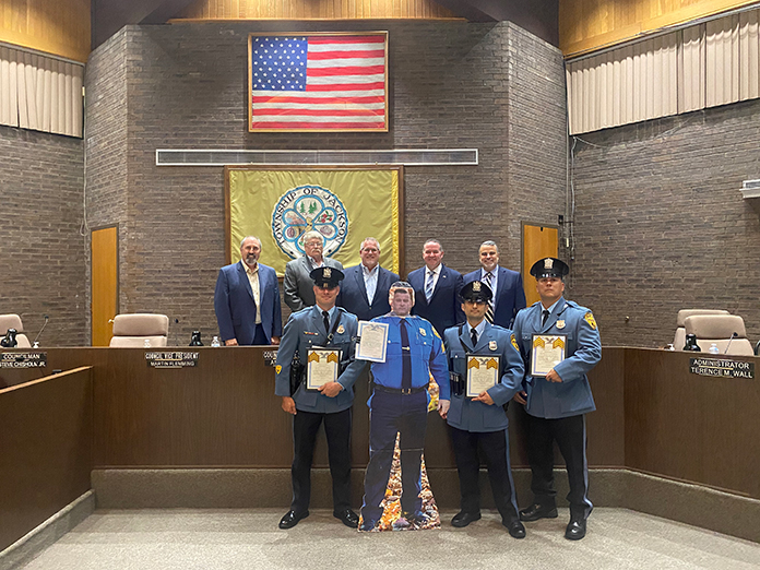 JACKSON – Township officials recognized members of the Jackson Police Department who were promoted recently and they voiced their opinion on the governor’s mandate for masking up students and school staff for the new school year.