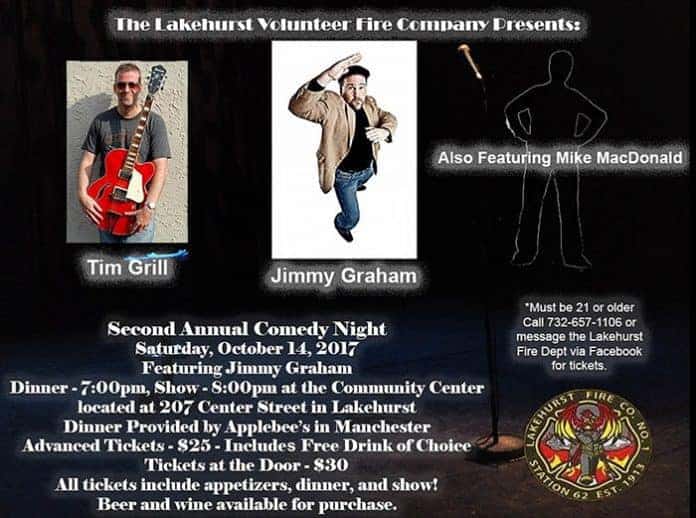LAKEHURST – The Lakehurst Volunteer Fire Company is presenting its 2nd Annual Comedy Night featuring Jimmy Graham, Tim Grill and Mike MacDonald on Saturday, October 14 at the Community Center, 207 Center Street.