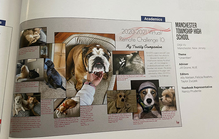 The article states that by being selected for inclusion, Deja Vu 2021 ranks among the best yearbooks printed by Walsworth. The yearbook features a 2020-2021 Virtual Remote Challenge 10: My Trusty Companion, featuring submissions by students of their pets who sat next to them during virtual learning. The year book’s overall theme was “Unwritten” and co-editors in chief were 2021 graduates Ally Nielsen, Felicia Roehm, and Taylor Zuczek.