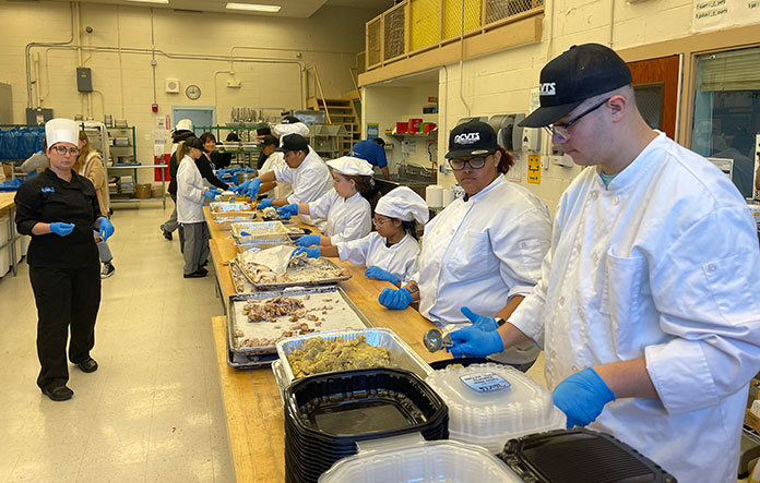 Chef Jill Scott, who teaches Introduction to Culinary Arts to high school juniors and seniors, had organized two assembly lines on the Tuesday before Thanksgiving when the students packed the dinners that consisted of 2 oz. of dark meat, 4 oz. of white meat, stuffing, mashed potatoes, sweet potato mash, green bean casserole and gravy.