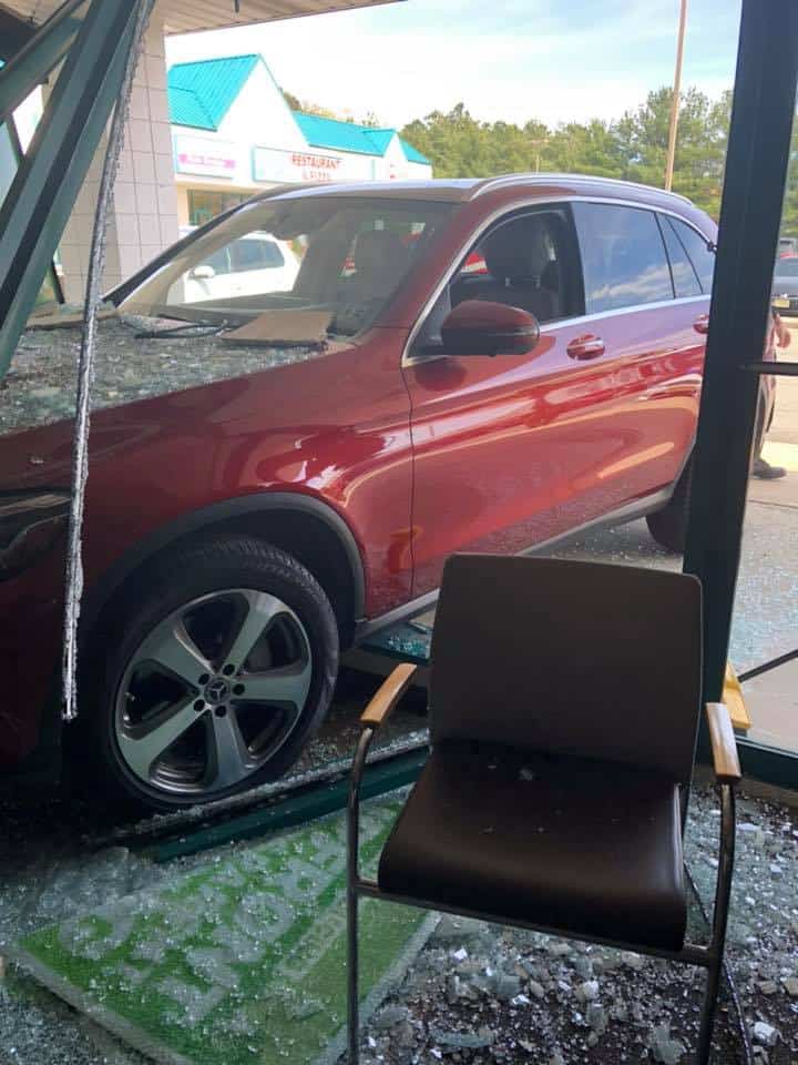 From photographs taken at the scene, the vehicle appears to be a red Mercedes-Benz SUV.