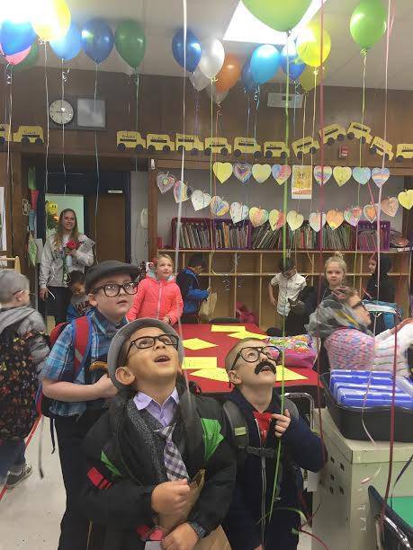The celebrations were led as classroom activities by teachers. At H & M Potter, Kindergarten students were surprised with 100 balloons as they came in to their classrooms this morning. Students in all grade levels dressed up as if they were 100 and others wore clothing with 100 items attached.