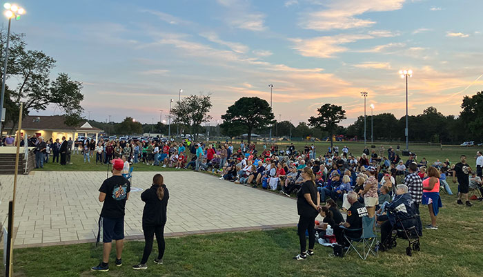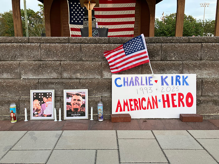 A small tribute with candles was placed near the bandstand, honoring Charlie Kirk. On one side of the stage was a poster of Kirk with the years 1993-2025. On the other side was a poster shared by two women: Iryna Zarutska and Minnesota Representative Melissa Hortman.