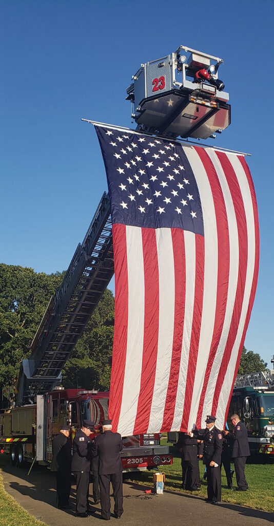 Firefighters assemble around the large American flag flying from a firetruck during this year’s 9-11 ceremony held at Windward Beach Park. (Photo by Bob Vosseller)
