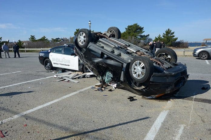 BRICK – A Brick Township Police officer and driver of another vehicle escaped with only minor injuries after that vehicle flipped onto the police cruiser.