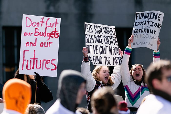 Once you get to the State House annex, you see the T-shirts signaling distress: SOS. Support Our Students. You see the poster board signs: Don’t cut our budgets and our futures. Education is an investment! Not an expense!!!