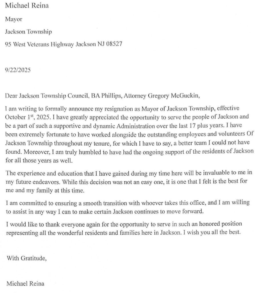 His resignation letter sent to the Council, Business Administrator Lavon Phillips and Township Attorney Gregory McGuckin noted his resignation would take effect on October 1. “I have greatly appreciated the opportunity to serve the people of Jackson and be a part of such a supportive and dynamic administration over the last 17 plus years.”