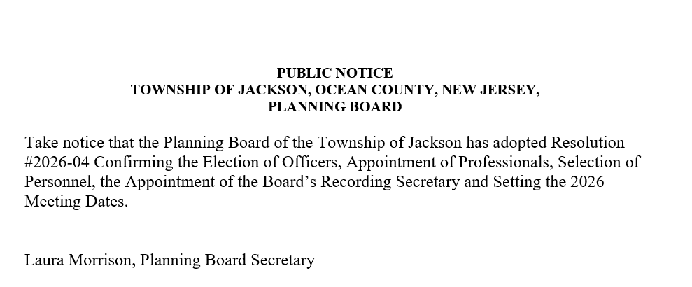 Jackson Legal Notice Public Notice – Jackson Planning Board By Jersey Shore Online - February 10, 2026 FacebookTwitterPinterestWhatsAppLinkedinReddItEmailPrint Photo by Bob Vosseller Subscribe To Jersey Shore Online Stay connected—get our e-editions, top stories and breaking news sent to your inbox. * indicates required Email Address *