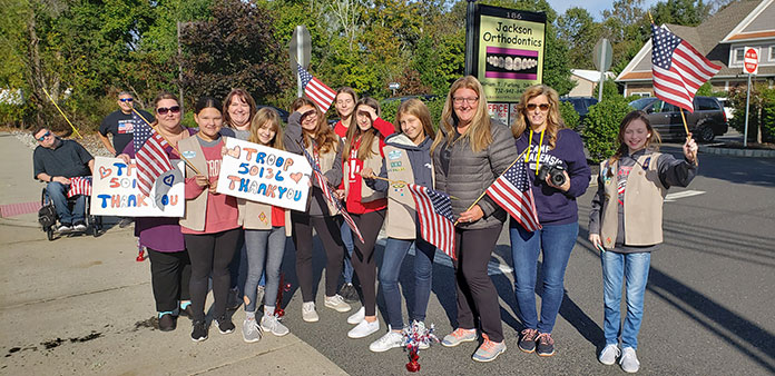 Members of the Jackson Girl Scout Troop 50136 were out in force as the warriors passed, waving American flags and holding up handmade posters along the parade route.