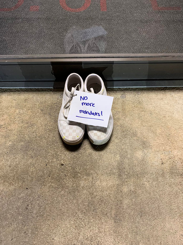 Officials from the district said that about 50 pairs of shoes were delivered. Notes and signs asked the district to end the mask mandate and to oppose any future mandates related to masks or vaccines. The display was up until about 10 a.m. when organizers came to retrieve the shoes. While they were there, Superintendent Pormilli came out to speak with them and to hear their concerns directly.