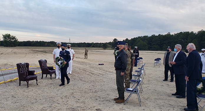“We have representation of each service present, a hallmark to our identity as a joint base,” Captain Sherrod noted. A representative of each member of the armed services presented a wreath in remembrance to those lost during the Hindenburg tragedy as well as commemorating U.S. Navy and U.S. Army airship loses and those fallen troops in Iraq and Afghanistan. Flags of each branch of the military flew behind the wreath presentation site including, for the first time, the U.S. Space Force during this year’s ceremony.