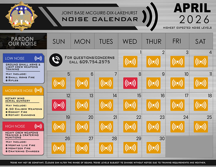 JOINT BASE MCGUIRE-DIX-LAKEHURST — Get ready for the Sounds of Freedom. Joint Base McGuire-Dix-Lakehurst has released its April noise calendar, giving nearby residents a heads-up on expected training activity and sound levels across the month. The base’s official website publishes information and updates for the installation, while local coverage has also tracked the monthly noise calendars.