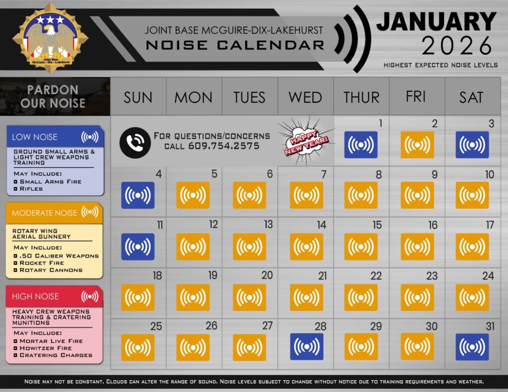 JOINT BASE MCGUIRE-DIX-LAKEHURST — Ahhh, the sounds of freedom in full force. Residents near Joint Base McGuire-Dix-Lakehurst can expect a range of training-related noise during January 2026, according to a monthly noise calendar released by the installation.