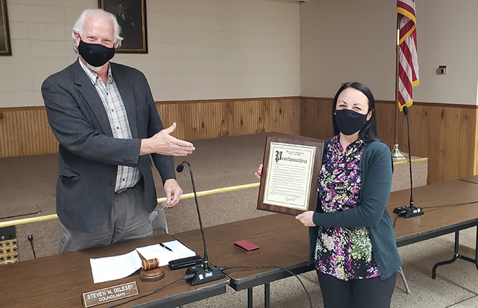 Early during the session the council recognized National Library Appreciation Week and presented a framed proclamation to Manchester Library Branch Manager Erin Batalla.