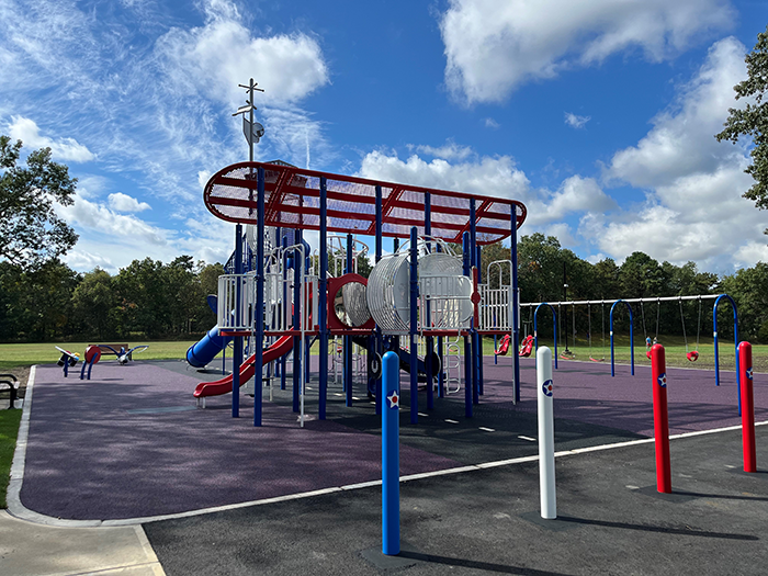 Tuskegee Airmen Park, located off Route 571 near Manchester Middle School and the Richards Estates neighborhood, maintains elements of its original design while offering new recreational features. The updated park includes an aviation-themed playground with aircraft-inspired structures, a control-tower play unit with an enclosed two-story slide, and a newly built red, white and blue basketball court. A monument and informational signage at the entrance honor the historic Tuskegee Airmen.