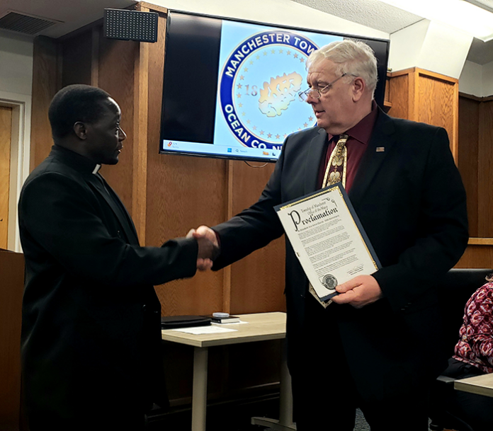 Mayor Joseph Hankins presented a proclamation to Reverend Evarist Kabagambe. The mayor’s proclamation covered some of the church’s half century history. The Roman Catholic parish is located in Whiting, within the Diocese of Trenton.