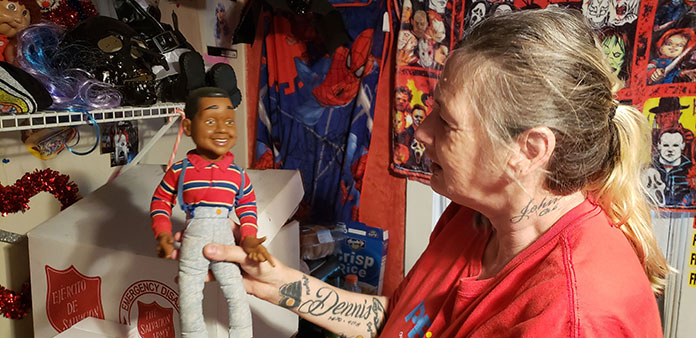 “I’ve lived here for 10 years,” she said. “I have cereal boxes, a Spider-Man kite hanging on the ceiling.” She has a number of Chucky dolls along with Chucky’s girlfriend Tiffany from the horror film and TV franchise featuring creepy dolls who have come to life.