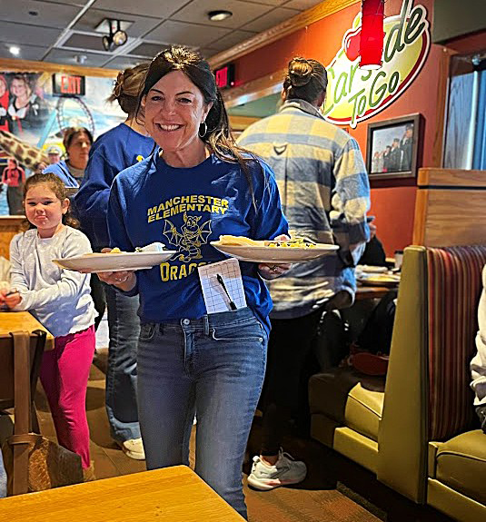 “MTES is truly a family, both inside and outside of our school doors,” Healy said. “The positive energy today was unmistakable, and it was heartwarming to see our community come together to support our students.” She enjoyed playing waitress and taking orders and delivering plates of flapjacks during the morning. She and Johnston also met up with Maverick for a photo opportunity.