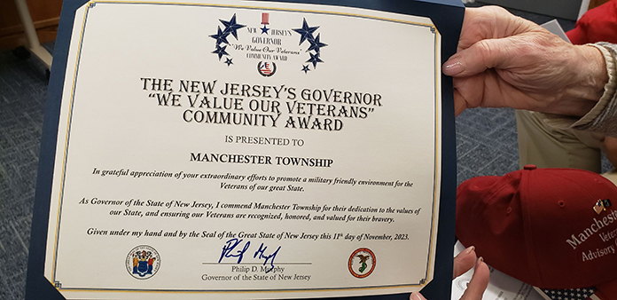 MANCHESTER – Mayors often present proclamations honoring residents for good deeds but the tables were turned on Mayor Robert Arace with his receiving a certificate that honored a township achievement concerning veterans during a recent council meeting.