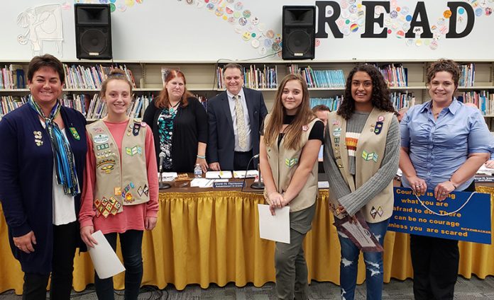 At a recent Board of Education meeting, MTHS freshmen Callie Rommel, Gabriella Edwards and Cheyenne Gann of Girl Scout Troop 300 were recognized for their Silver Award project, which focused on kindness, respect and character education.