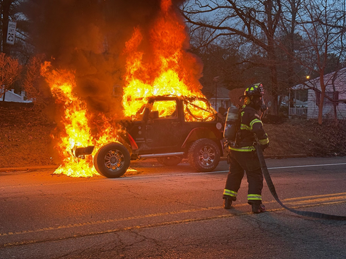 When officers arrived, they found a black 2012 Jeep Wrangler fully involved in fire. The vehicle was unoccupied, and officers quickly secured the area while firefighters were dispatched.