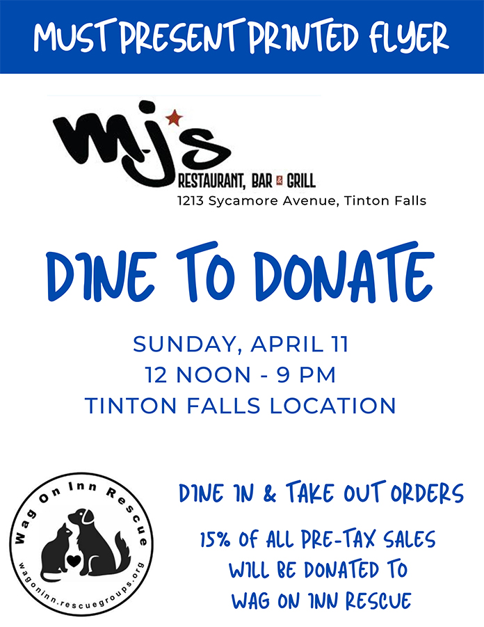 TINTON FALLS – Wag On Inn Rescue has partnered up with MJ’s Restaurant, Bar and Grill, to host a Dine to Donate event.