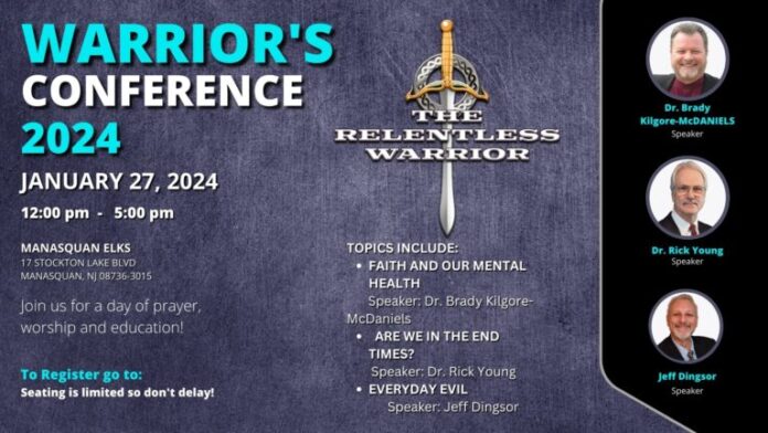 MANASQUAN – Full Armor Productions, LLC is humbled to announce the inaugural “Warrior’s Conference 2024,” a groundbreaking event that brings together modern-day faith leaders, experts, and enthusiasts from across the country for a day of prayer, worship, and education. The event is set to take place at the Manasquan Elks, 17 Stockton Lake Boulevard, Manasquan, on January 27 from 12 to 5 p.m.