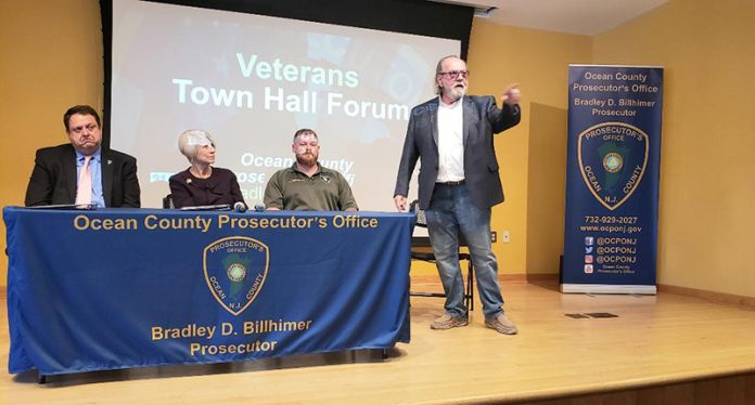 The Veterans Town Hall was sponsored by the Ocean County Prosecutor’s Office and featured guest speakers Freeholder Director Virginia Haines, Purple Heart recipient and retired U.S. Marines Corporal Rory Hamill, Ocean County Prosecutor Bradley Billhimer and Ocean County Veterans Service Bureau Director John Dorrity.