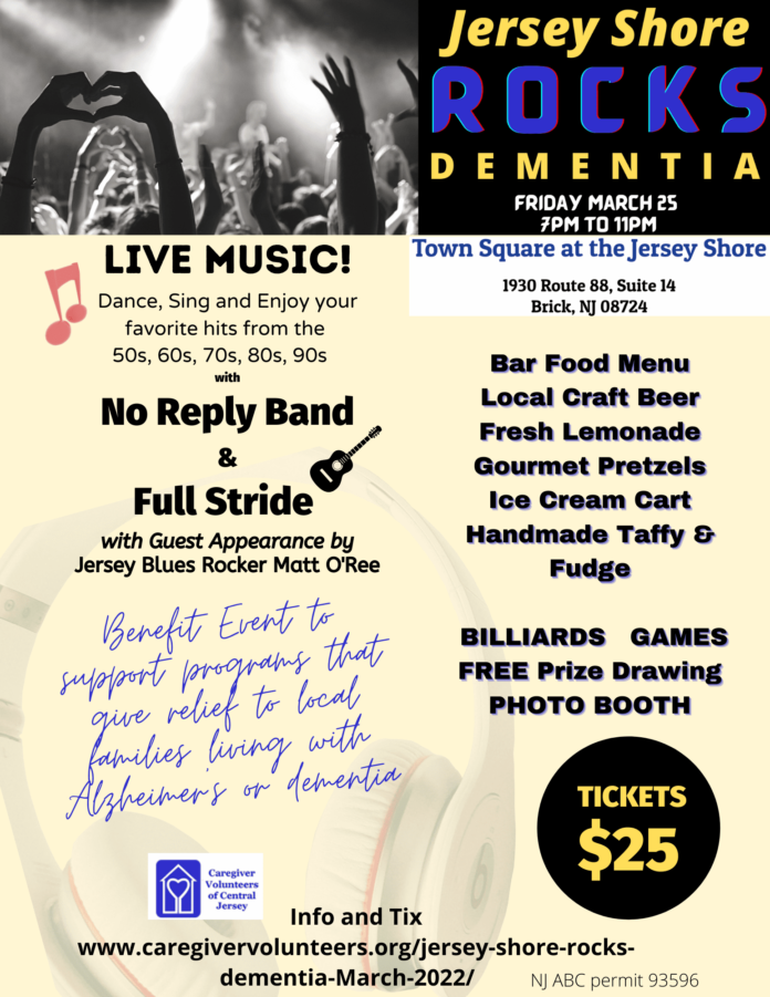 TOMS RIVER – Jersey Shore ROCKS Dementia Benefit event for Caregiver Volunteers of Central Jersey (CVCJ) is taking place on March 25 from 7 to 11 p.m. at Town Square at the Jersey Shore, 1930 NJ-88, Brick Township.