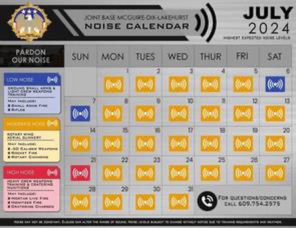Every month, JBMDL releases their “Noise Level Calendar” so residents know when to expect mild or severe noise. This is to deter calls to local 911 dispatchers. The calendar is labeled with three different levels of noise: slight noise, moderate noise and abundant noise.