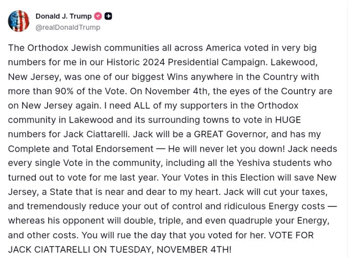 OCEAN COUNTY – President Donald Trump is calling on the Orthodox Jewish community in Lakewood to rally behind Republican gubernatorial candidate Jack Ciattarelli as New Jersey’s election approaches tomorrow.