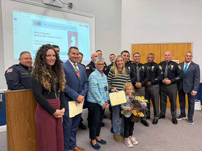 During the latest Stafford Township Board of Education meeting, Patrolmen Caporrino and Walker, along with members of the Stafford Township Fire Department and Stafford EMS, were commended for their fast response during the recent incident.