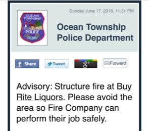 An alert was sent out from the Ocean Township Police Department via email and the Nixle text alert system at around 11:32 p.m. urging residents to stay away from the area to allow the professionals on scene to do their jobs.