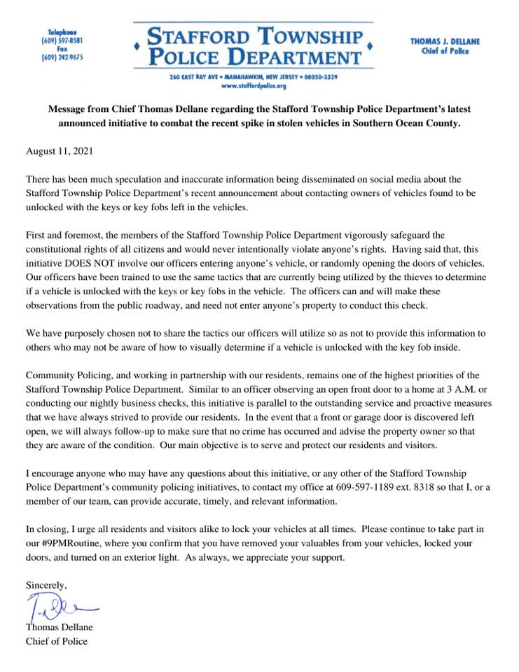 “First and foremost, the members of the Stafford Township Police Department vigorously safeguard the constitutional rights of all citizens and would never intentionally violate anyone’s rights. Having said that, this initiative does not involve our officers entering anyone’s vehicle, or randomly opening the doors of vehicles. Our officers have been trained to use the same tactics that are currently being utilized by the thieves to determine if a vehicle is unlocked with the keys or key fobs in the vehicle. The officers can and will make these observations from the public roadway, and need not enter anyone’s property to conduct this check,” Dellane wrote.