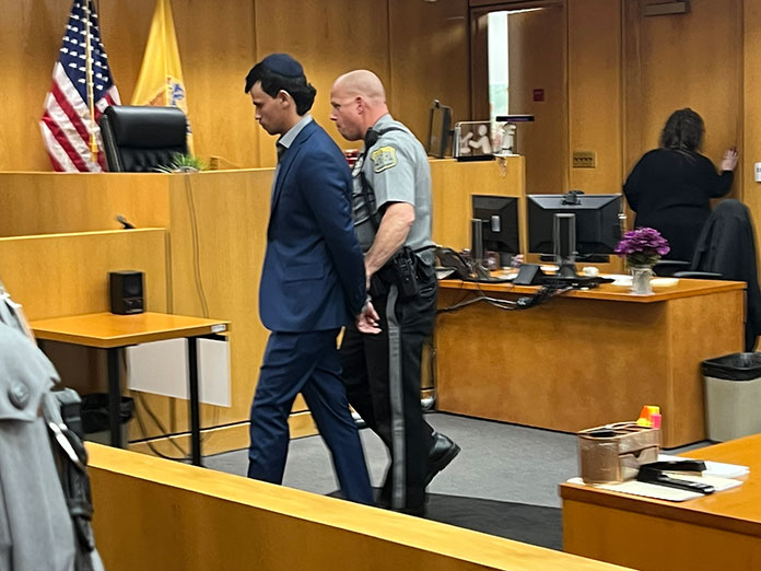 Avrohom Pam was handcuffed and led away by a Sheriff’s officer after Judge Palmer sentenced him to 364 days in the Ocean County Jail as a condition of a three-year term of probation. Pam was also ordered to pay restitution.