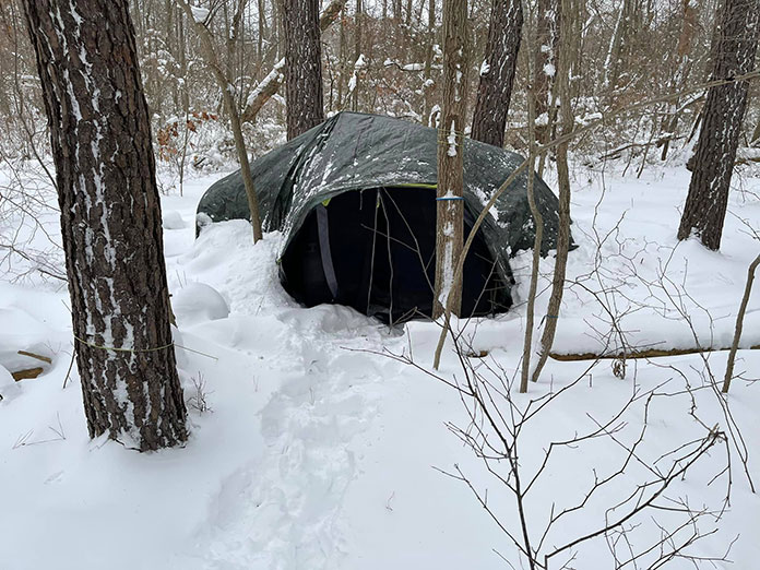 An encampment in the woods had residents with some issues. A zipper in front of someone’s tent had frozen over. Another didn’t have anything to eat. He had a tarp and some food from the Lakewood Elks in his truck.