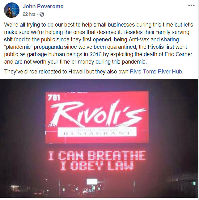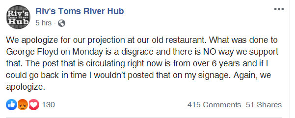 TOMS RIVER – The owner of Riv’s Toms River Hub issued an apology for a post that’s come up in social media with a controversial photo of the digital sign outside their old location.
