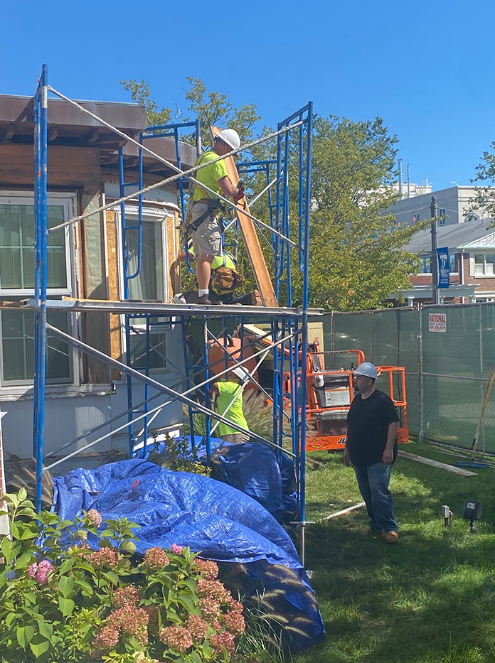All of the soffits and gutters will also be replaced. The newer portion of the building, which dates back to the 1970s, had exposed cedar fascia that is now being eaten by carpenter bees. These will be replaced and clad with aluminum. There will be some decorative portions that will be accented with copper fish scale shingles to match the existing roofs. Additionally, the rear doors from the parking deck will also be replaced and upgraded to meet the current standards of the Americans With Disabilities Act.
