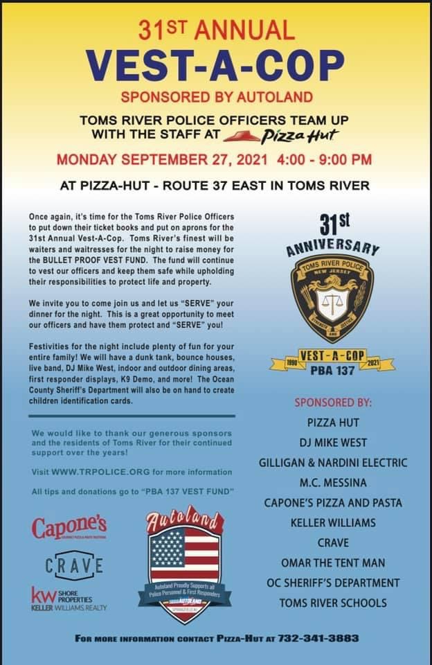 TOMS RIVER – Toms River Police Officers are teaming up with the staff at Pizza Hut on Route 37 East for the 31st Annual Vest-A-Cop on September 27 from 4 to 9 p.m.